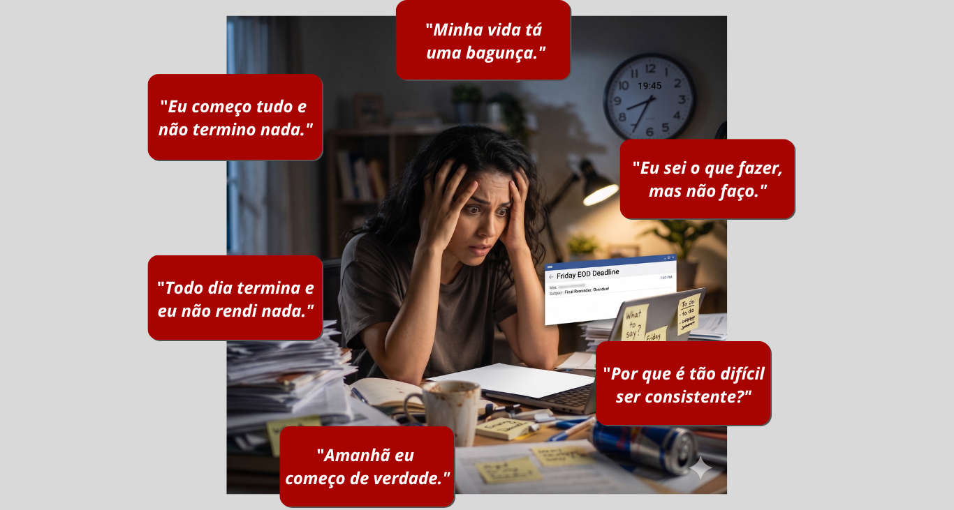 Um passo a passo prático e comprovado para você sair da paralisia e entrar em ação imediatamente, mesmo que você nunca tenha conseguido ser consistente antes.