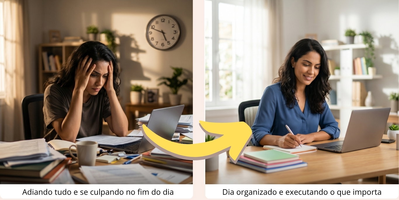Você identifica a tarefa principal que, se feita hoje, faz tudo o resto parecer mais fácil. Isso elimina a paralisia e te coloca em movimento imediatamente.