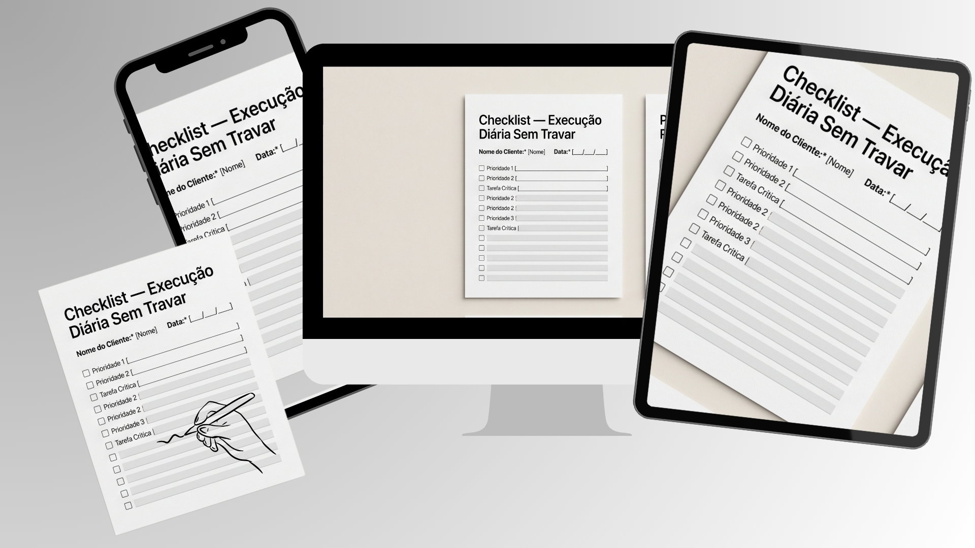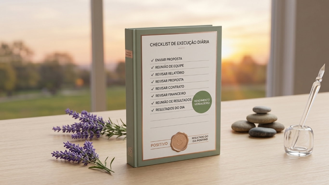Com o checklist diário em mãos, você sabe exatamente o que já fez e o que ainda precisa fazer — e termina o dia com a consciência limpa de que rendeu de verdade.