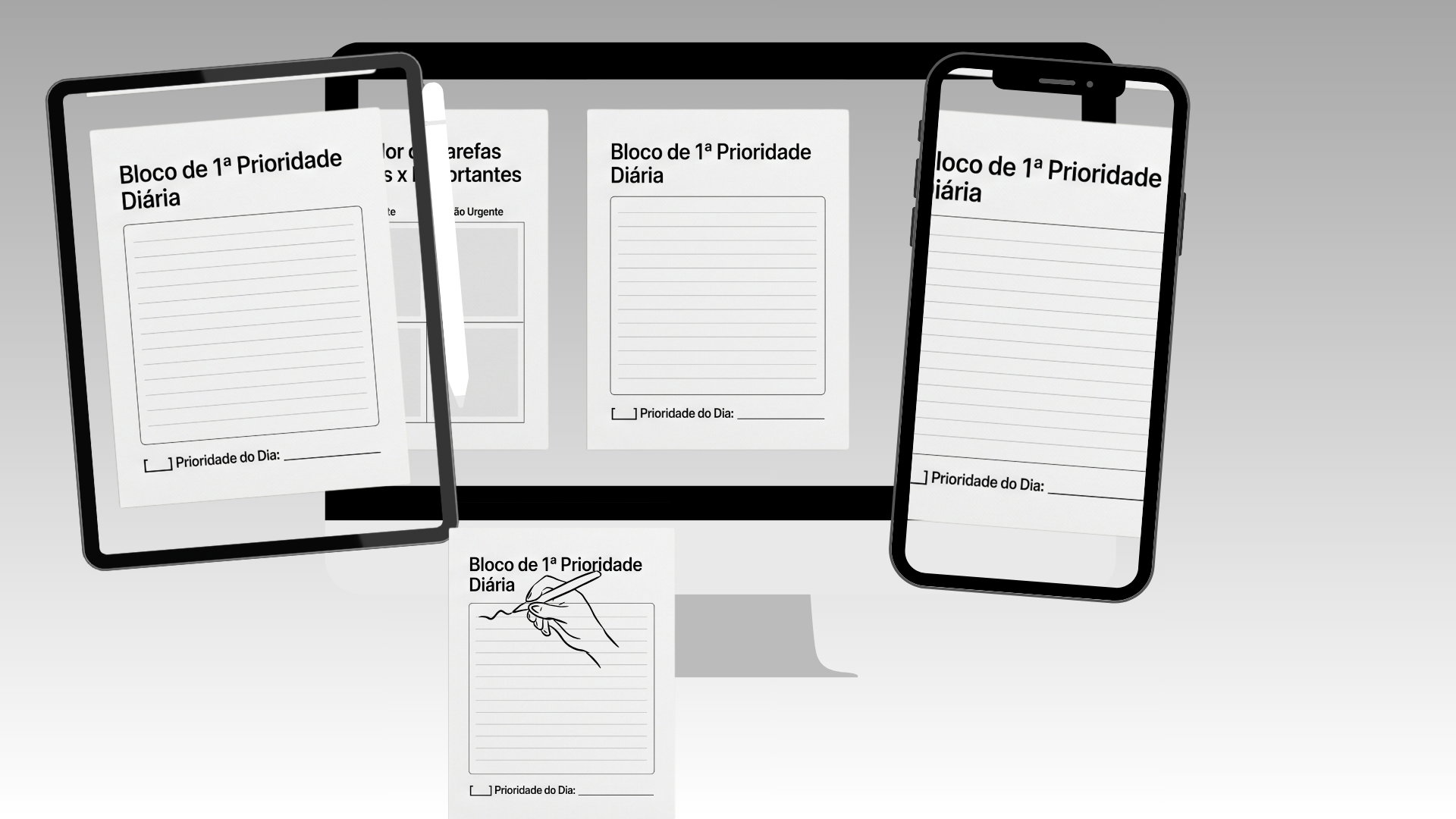 Você vai receber o bloco que revela a única tarefa que realmente precisa ser feita hoje. Quem usa esse bloco para de se perder em mil coisas e começa a ter resultados reais todo dia.