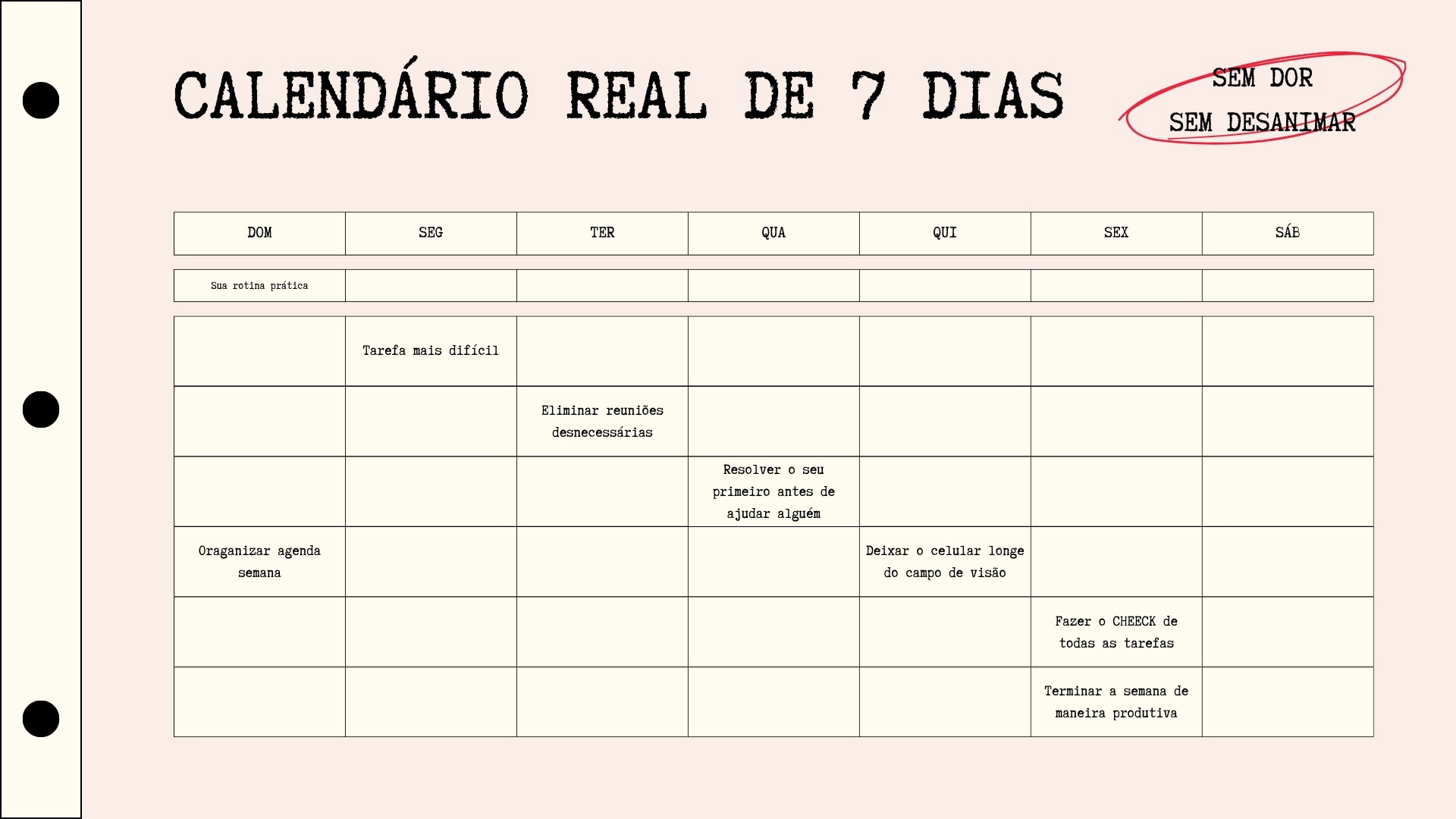 O calendário tem toda a sua programação diária, para você construir uma rotina que funciona de verdade em apenas 7 dias sem depender de força de vontade.